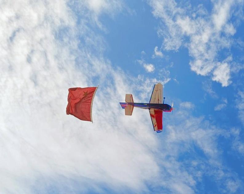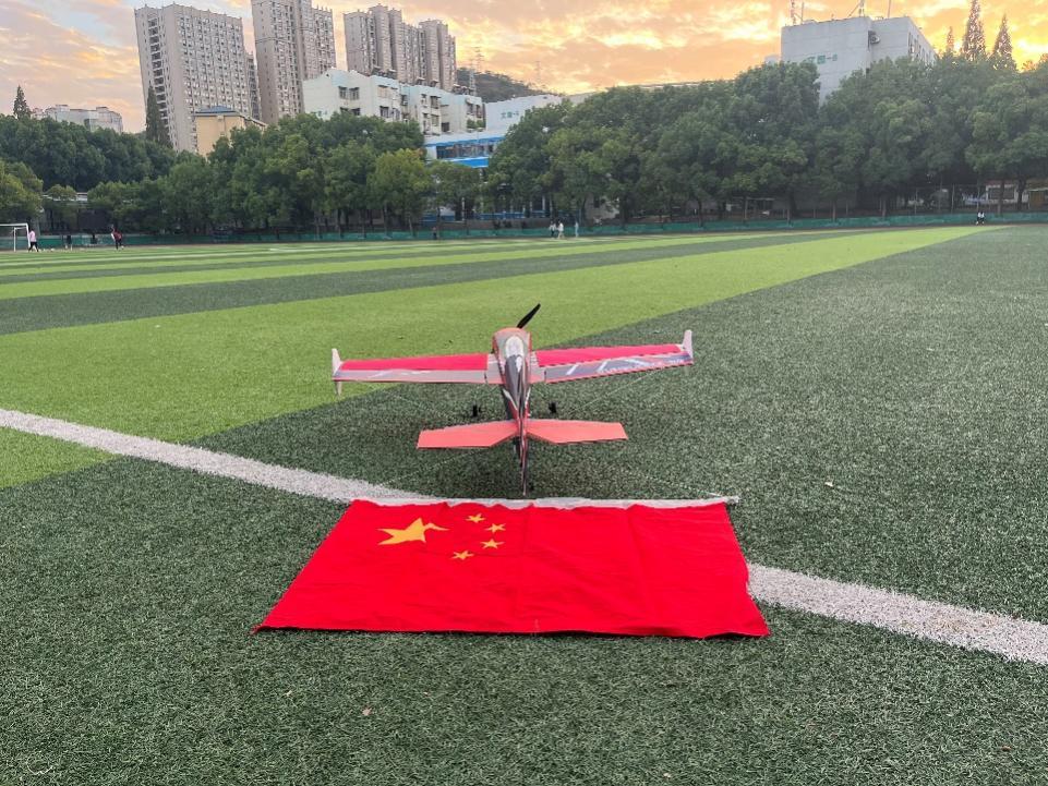 在文园与听涛操场,伴随着引擎的轰鸣声,一架遥控飞机三角翼航模托举着鲜红的五星红旗在空中翱翔,留下一道道绚丽的轨迹。现场师生屏息凝视着航模在空中飞行的精彩瞬间,仿佛置身于广阔的蓝天之中。飞行操作员以精准的控制和高难度特技充分展示航模飞行的魅力,现场不时爆发出阵阵掌声和欢呼声。同学们纷纷举起手机,记录下这难忘的瞬间,有的同学则兴奋地讨论着航模的构造与飞行原理,整个操场洋溢着浓厚的学术气息与爱国热情。