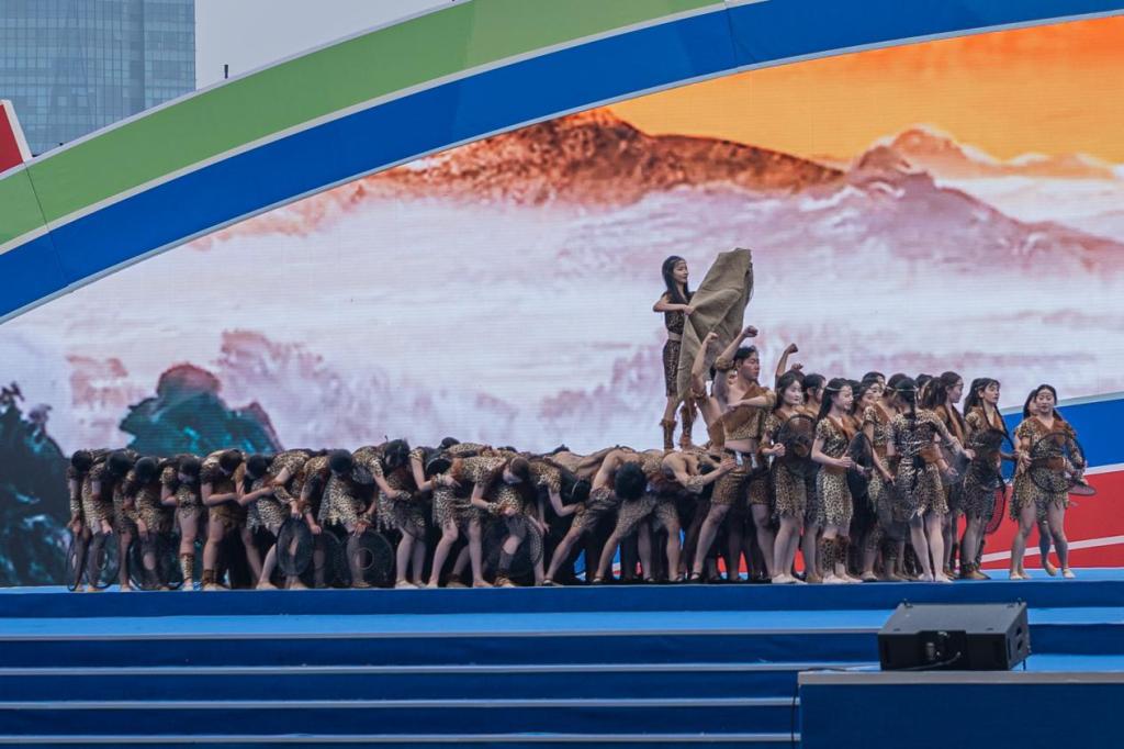 第一篇章《炎黄一脉》中,pg娱乐百余名学子身着传统服饰,仿佛从历史的长河中走来,随着音乐的缓缓流淌,以灵动的舞姿诠释着古老文明的传承,让神农氏带领先民们辛勤耕作的场景活现在观众眼前。在第三篇章《星火四方》中,红色的旗帜在舞台上猎猎飘扬,旗帜之下,学子们身着戎装,神情坚毅,再现了波澜壮阔的革命岁月,激昂的节奏和有力的动作充满活力与希望。