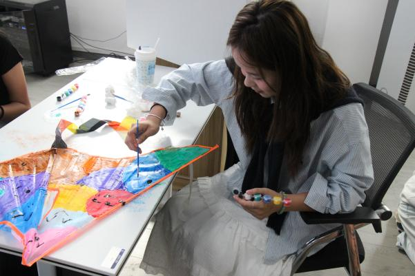 活动现场,同学们开启了心灵治愈与美育体验的双重探索。在手工体验环节,大家挑选自己心仪的风筝样式和颜料,精心组装、绘制风筝。对于艺术学院的学生而言,画笔是他们表达内心世界的有力工具,他们用灵动的笔触,在风筝上绘下色彩斑斓的图案,将学业压力、生活困扰都随着颜料挥洒出去,尽情享受手工创作带来的乐趣。
